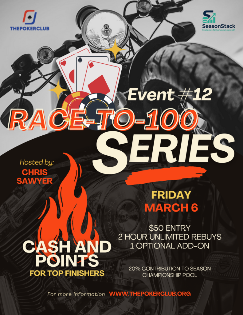Private club membership Monthly multi-table No Limit Texas Hold’em tournaments Earn Cash and LeaderBoard points during each poker ‘season’ Top performers qualify for a Championship Tournament Championship Winner earns the Club Trophy